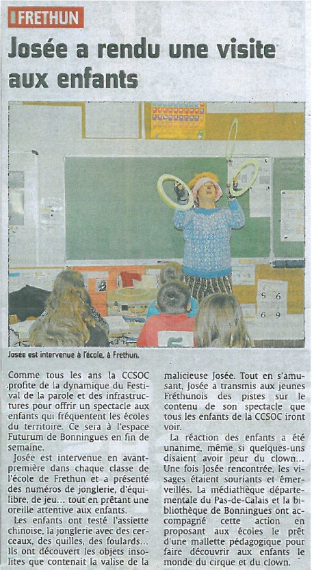 Le 14 novembre 2014 Josée est intervenue en avant-première dans chaque classe de l'école de Fréthun et a transmis aux jeunes des pistes sur le contenu de son spectacle. Les 20 et 21 novembre les 665 enfants de la Communauté de commune ont pu découvrir Josée sur scène.
